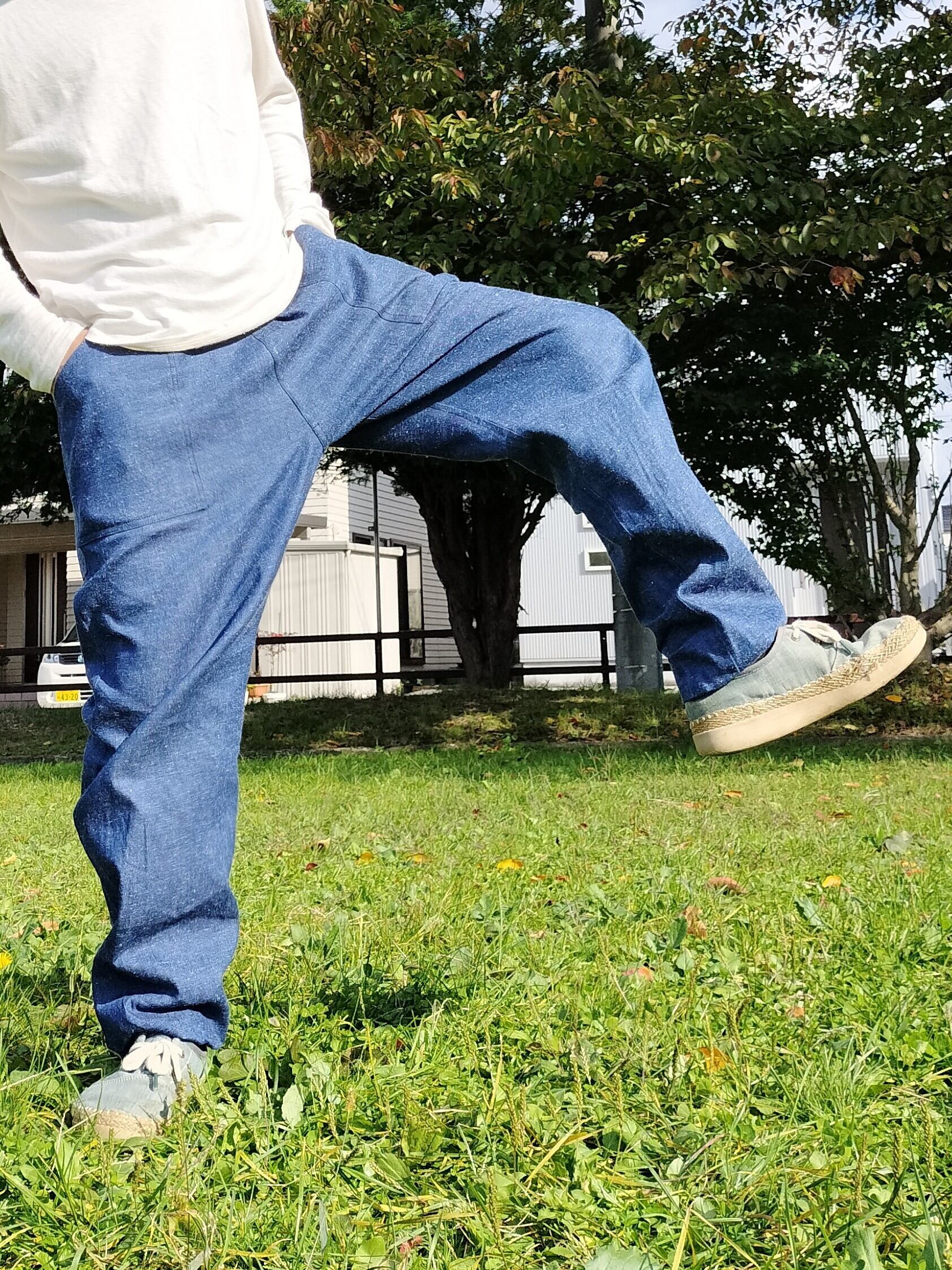 旅人の百姓袴(もんぺ)のデニム仕様。